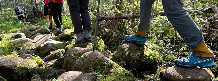 Crossing streams, marshes, or muddy areas during spring and fall hikes