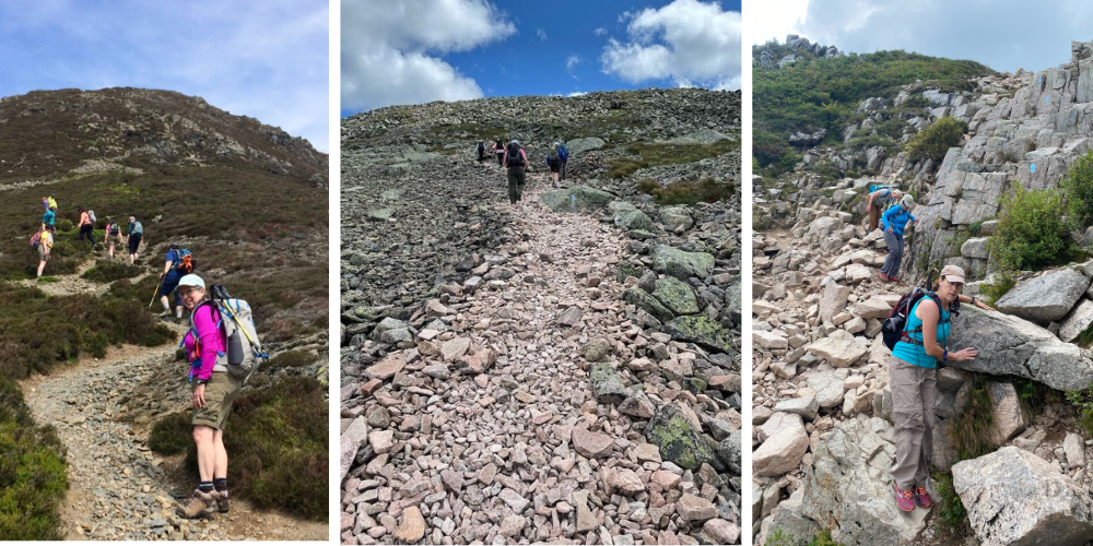 The three main types of this kind of trail are scree, talus, and boulders. You can see these types of rocky trails below, from left to right: