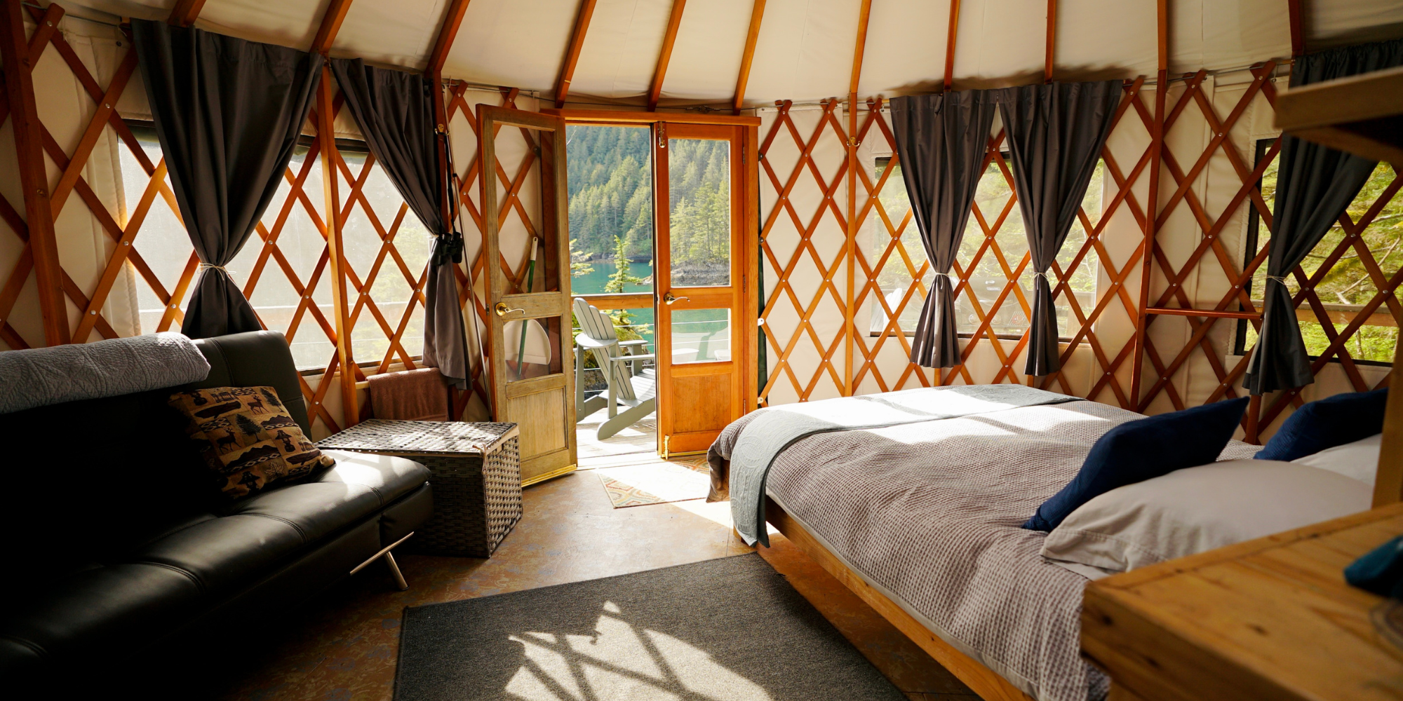 These thoughtfully designed yurts combine comfort with a true back-to-nature experience. Each one includes comfortable beds, solar power, a private bathroom, a cozy living space, and a large deck overlooking the water.